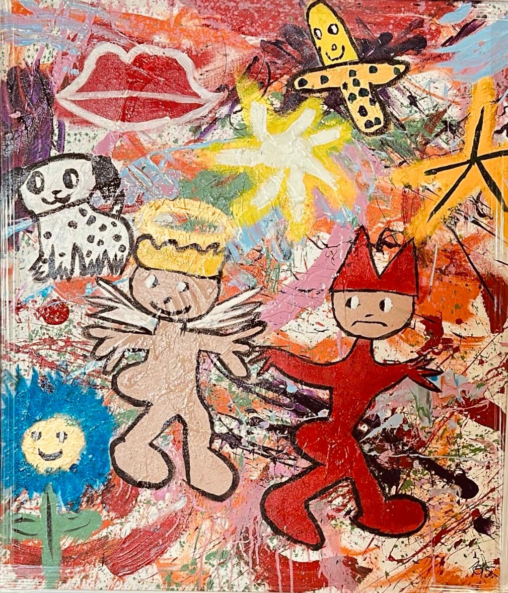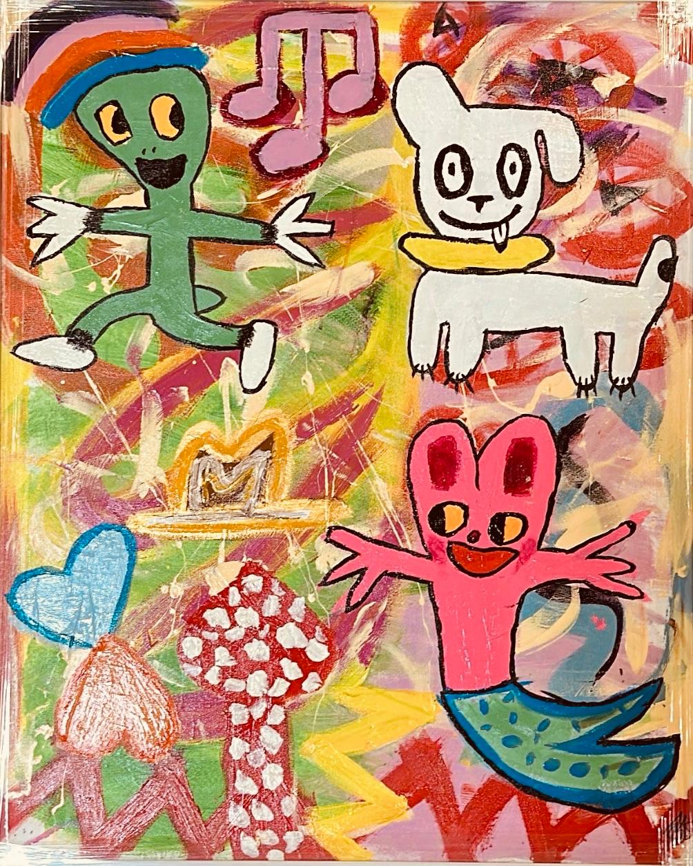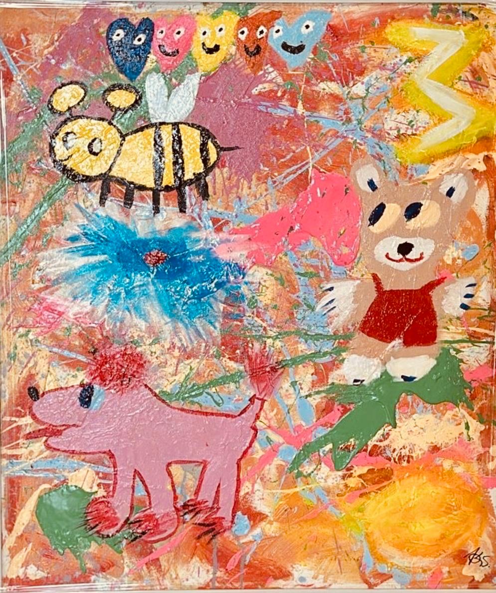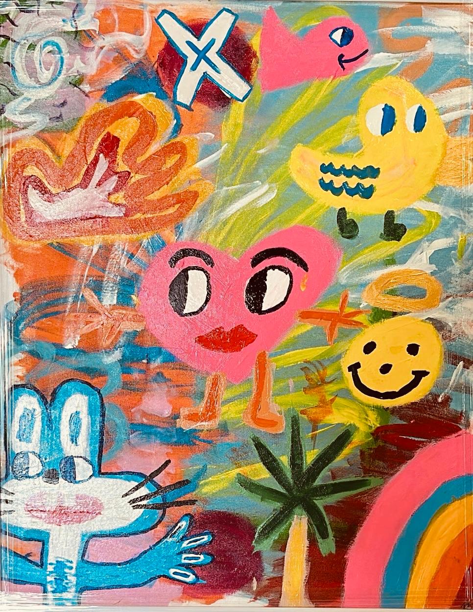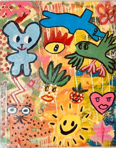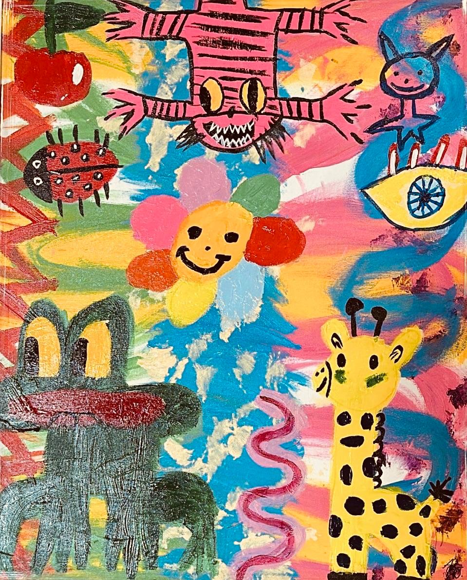 A joyful explosion of colors and symbols—hearts, eyes, creatures, and sun—dancing together in playful chaos where innocence and imagination shine without limits.